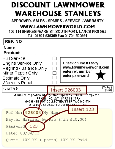 Welcome to Lawnmower Worlds Spare's Order Lookup Program. Here you can find your current spare part order and check on its progress